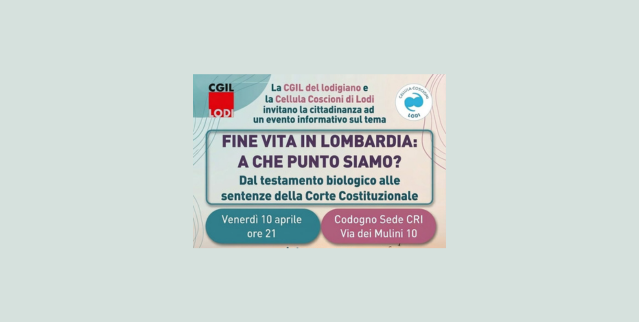 La Cellula Coscioni Lodi, insieme alla CGIL del Lodigiano, promuove l’incontro pubblico “Fine vita in Lombardia: a che punto siamo? Dal testamento biologico alle sentenze della Corte costituzionale”, un momento di approfondimento aperto alla cittadinanza sui diritti nel fine vita e sul quadro normativo attuale.