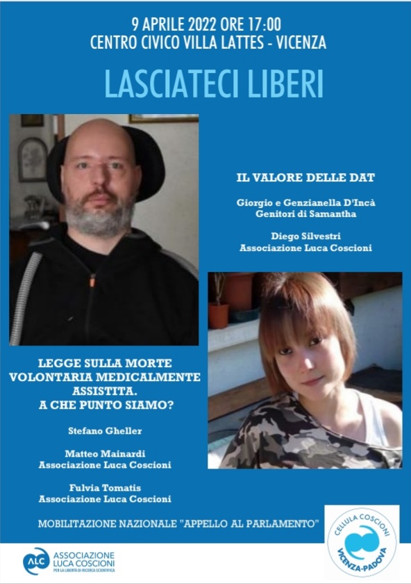 L’incontro si articola in due parti. Nella prima parte si parla del valore delle DAT, con gli interventi di GiorgioGenzianella D’Incà, genitori di Samantha, e di Diego Silvestri, presidente della Cellula Coscioni di Vicenza-Padova. Nella seconda parte, invece, si parla di “Legge sulla morte volontaria medicalmente assistita. A che punto siamo?” con Stefano GhellerMatteo Mainardi, coordinatore della campagna Eutanasia Legale, e Fulvia Tomatis, membro della Cellula Coscioni di Vicenza-Padova.