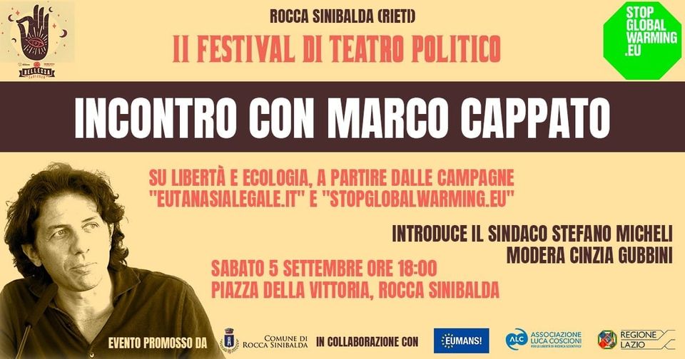 Il tesoriere dell’Associazione Luca Coscioni, Marco Cappato, parteciperà al Festival di Teatro Politico di Rocca Sinibalda, in provincia di Rieti.