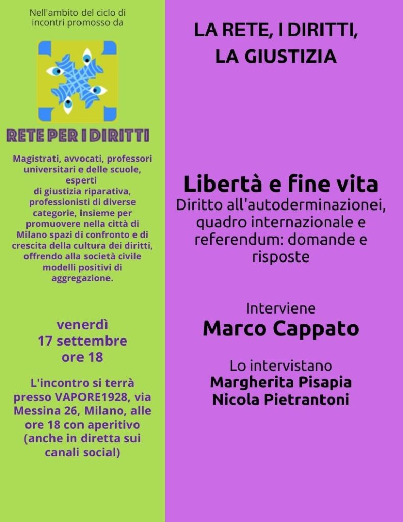 Il tesoriere dell’Associazione Luca Coscioni, Marco Cappato, è ospite a Milano della Rete dei Diritti, dove parlerà di Fine vita e del Referendum Eutanasia Legale.