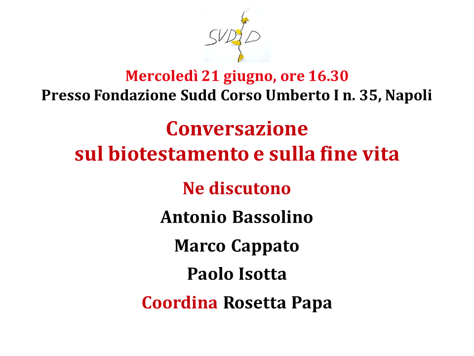 Marco Cappato, Tesoriere dell’Associazione Luca Coscioni, interverrà all’incontro “Conversazione sul testamento biologico e sulla fine vita”, che si terrà mercoledì 21 giugno alle ore 16:30 a Napoli presso la Fondazione Sudd (Corso Umberto I n.35).