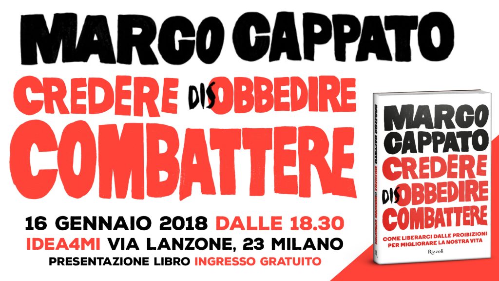 Marco Cappato, tesoriere dell’Associazione Luca Coscioni, sarà a Milano per presentare “Credere, disobbedire, combattere: come liberarci dalle proibizioni per migliorare la nostra vita“. L’appuntamento è per martedì 16 gennaio 2018 dalle 18:30 ad Idea4Mi in via Lanzone, 23 a Milano.