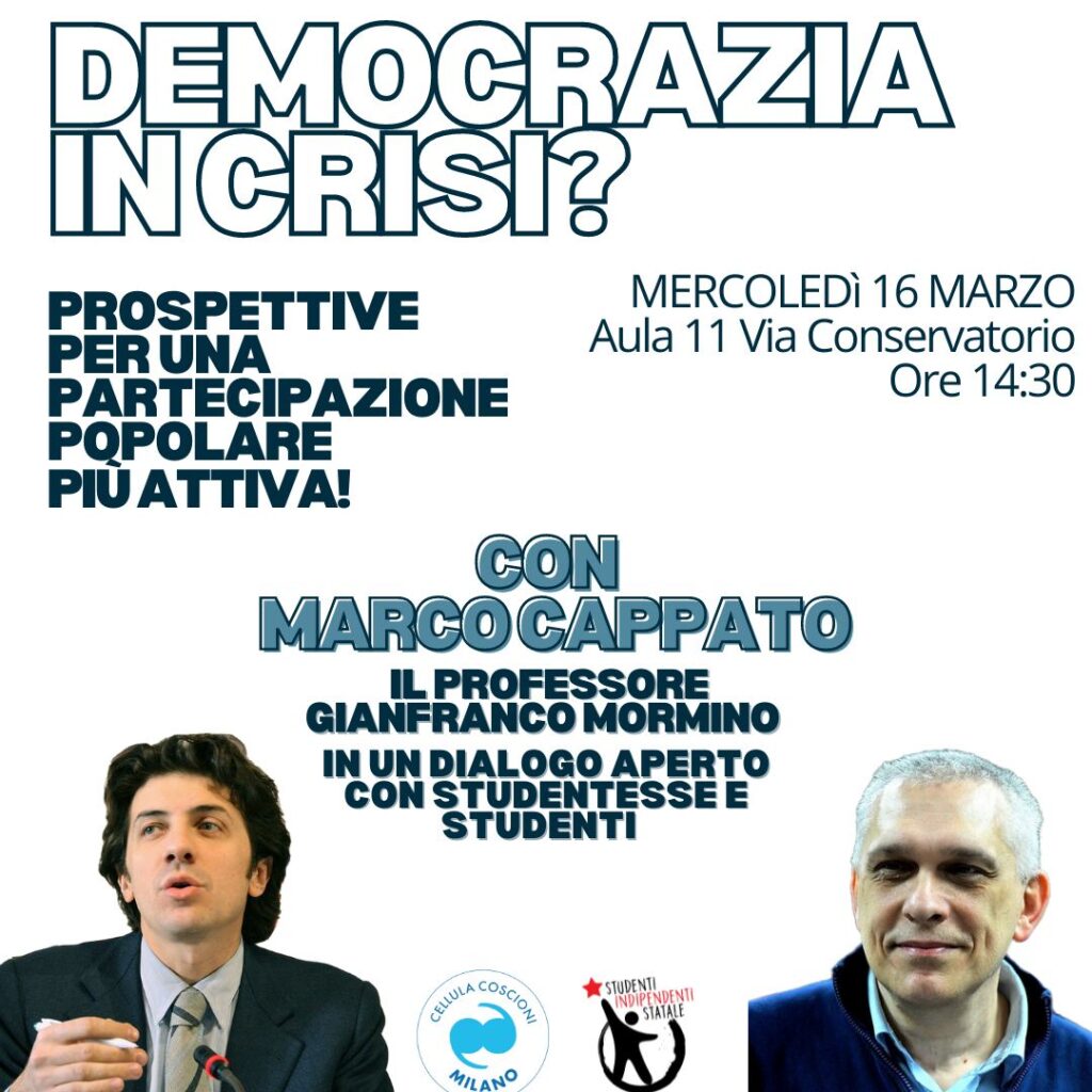 Il Tesoriere dell’Associazione Luca Coscioni, Marco Cappato, partecipa all’incontro Democrazia in Crisi? Prospettive per una partecipazione popolare più attiva, organizzato da Studenti Indipendenti Statale e la Cellula Coscioni di Milano.