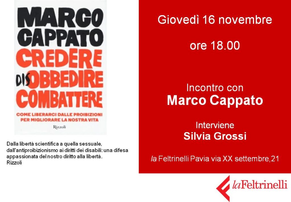 Marco Cappato, tesoriere dell’Associazione Luca Coscioni, presenterà a Pavia il suo libro Credere disobbedire combattere. Come liberarci dalle proibizioni per migliorare la nostra vita, edito da Rizzoli. L’appuntamento è per giovedì 16 novembre 2017 alle 18:00 alla libreria Feltrinelli in via XX Settembre 21, a Pavia.
