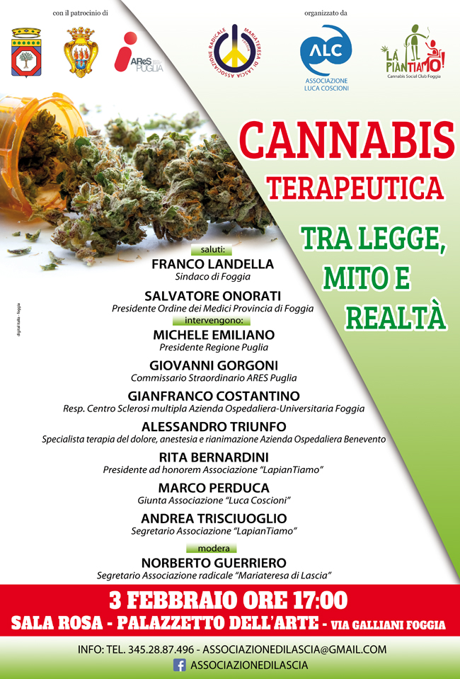 Marco Perduca, Membro di Giunta dell’Associazione Luca Coscioni e Coordinatore nazionale della campagna “Legalizziamo!”, parteciperà ad un evento a Foggia su cannabis terapeutica. Difatti, a distanza di 3 anni dall’introduzione delle leggi regionali n.2/14 e n.33/14 con le quali la Regione Puglia ha riconosciuto il diritto dei pazienti all’utilizzo di medicinali e preparati galenici a base di cannabinoidi per finalità terapeutiche, l’Associazione di Foggia “Mariateresa di Lascia”, in collaborazione con l’Associazione “LaPiantiamo” e l’Associazione “Luca Coscioni”, promuove un momento di riflessione sull’effettivo accesso dei pazienti pugliesi alla cannabis ad uso terapeutico, attraverso un incontro pubblico che si terrà il 03 Febbraio, alle ore 17.00, presso la sala rosa del palazzetto comunale dell’arte “Andrea Pazienza” a Foggia.