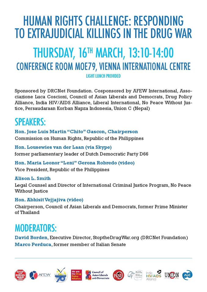 Marco Perduca, Membro di Giunta dell’Associazione Luca Coscioni, interverrà al Side Event organizzato a Vienna in ambito UNODC su quanto sta accadendo nelle Filippine, dove la “guerra alla droga” sta mietendo centinaia di vittime.
