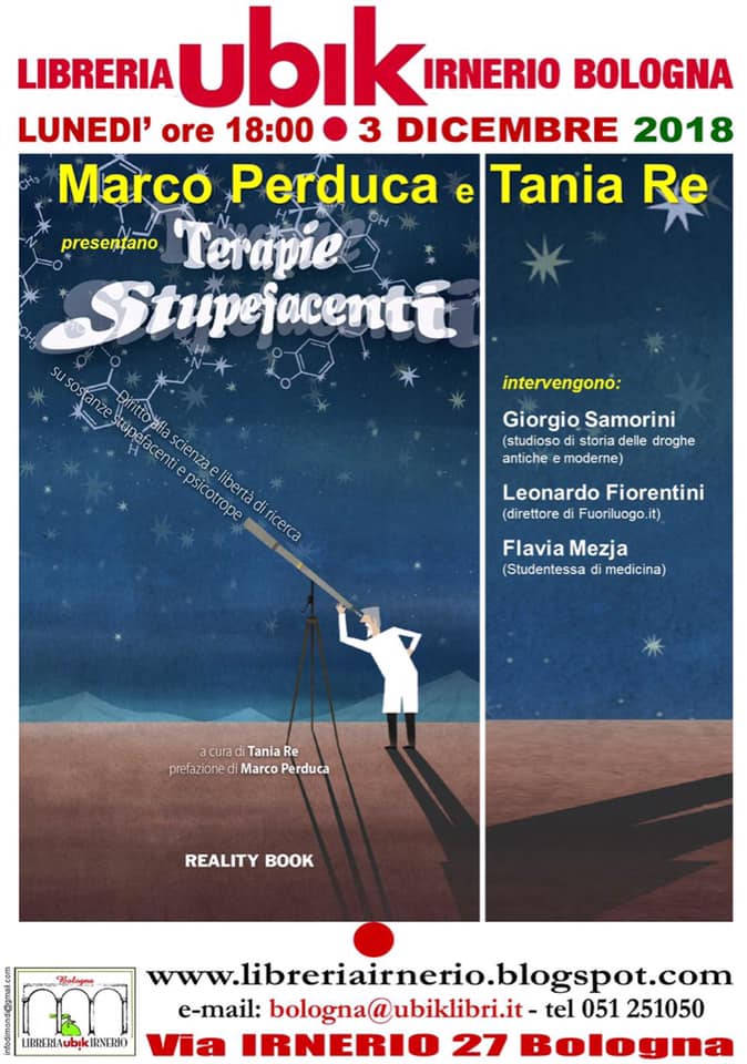 Dialogheranno con gli autori Giorgio Samorini, ricercatore indipendente, Leonardo Fiorentini, direttore FuoriLuogo.it e Flavia Mezja, studentessa di medicina e Presidente della Cellula Coscioni di Bologna.