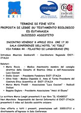 Venerdì 8 aprile 2016, alle ore 17,30, presso la Sala Conferenze dell’Hotel Ai Tigli a Pilastro di Langhirano (PR) via Parma 44 , si svolge l’incontro su TERMINI DI FINE VITA –PROPOSTA DI LEGGE SU TESTAMENTO BIOLOGICO ED EUTANASIA – SUICIDIO ASSISTITO promosso da “Exit Italia – Associazione italiana per il diritto ad una morte dignitosa” e “Associazione Luca Coscioni per la libertà di ricerca scientifica – Radicali Italiani” – in concomitanza con la discussione, avviata dalle Commissioni Parlamentari della Camera dei deputati, della proposta di legge di iniziativa popolare su testamento biologico ed eutanasia.