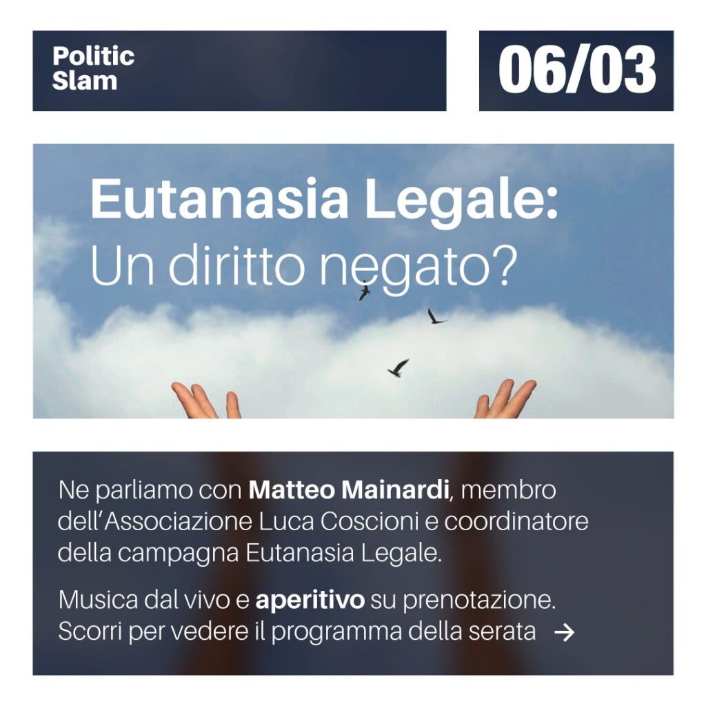 Il coordinatore della campagna Eutanasia Legale, Matteo Mainardi, partecipa all’evento Eutanasia legale: un diritto negato? organizzato con il patrocinio del comune di Ponte Lambro.