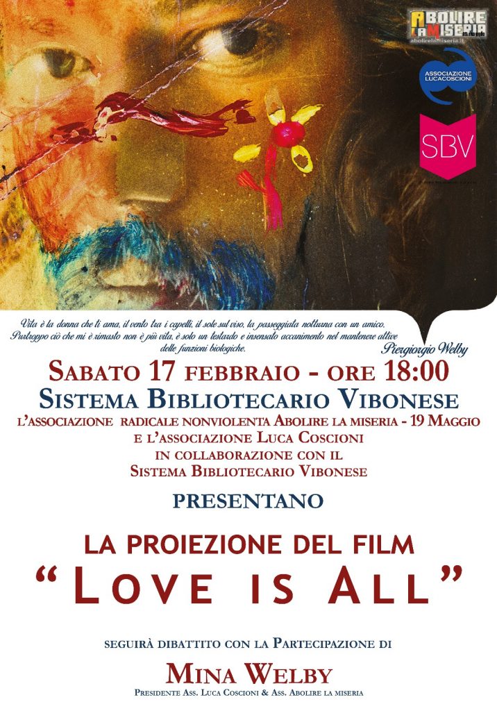 La co Presidente dell’Associazione Luca Coscioni, Mina Welby, parteciperà alla proiezione del film “Love is all“. L’evento è organizzato in collaborazione con l’Associazione Radicale Abolire la miseria – 19 maggio e il Sistema bibliotecario vibonese.