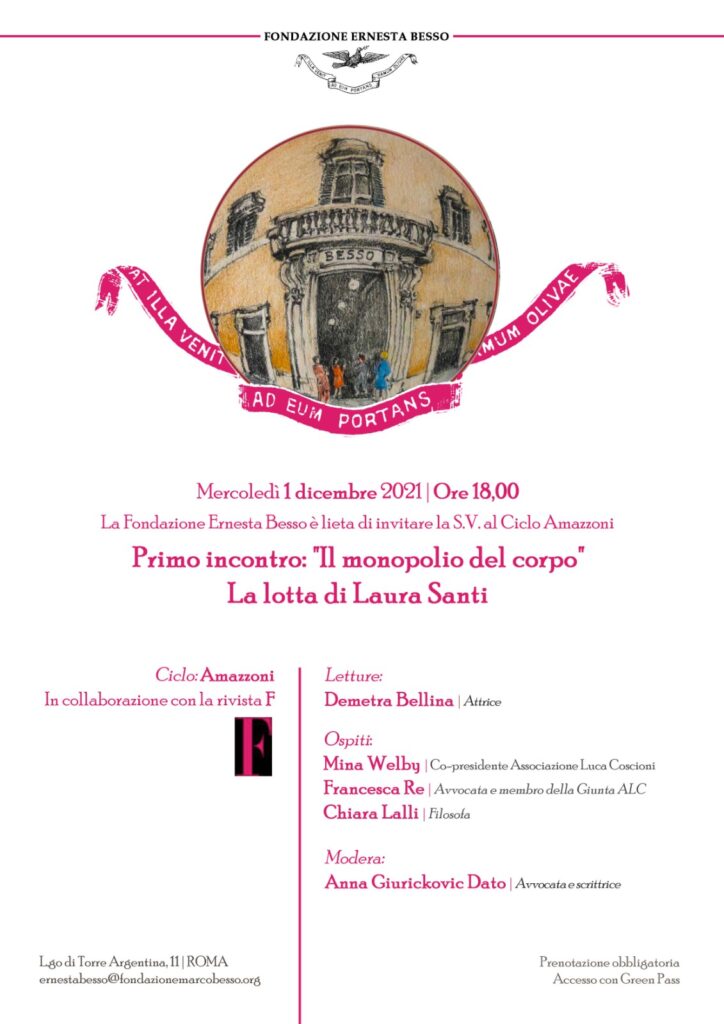 Mina Welby e Francesca Re, rispettivamente co Presidente e membro della Giunta dell’Associazione Luca Coscioni, partecipano al primo incontro Il monopolio del corpo: la lotta di Laura Santi organizzato dalla Fondazione Ernesta Besso, in collaborazione con la rivista F per il ciclo “Amazzoni”.