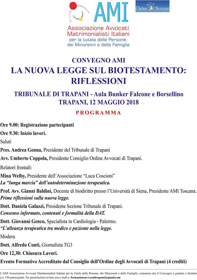 Si ricorda che l’evento è accreditato dal Consiglio dell’Ordine degli Avvocati di Trapani e la partecipazione consente di ottenere 4 crediti.