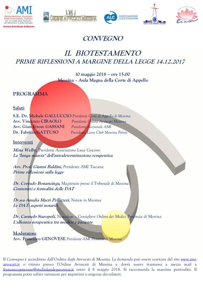 La co Presidente dell’Associazione Luca Coscioni, Mina Welby, e l’avvocato professor Gianni Baldini, consigliere generale dell’Associazione Luca Coscioni, saranno a Messina per partecipare al convegno “Legge 219/17: Biotestamento prime riflessioni a margine della legge 14.12.2017”.