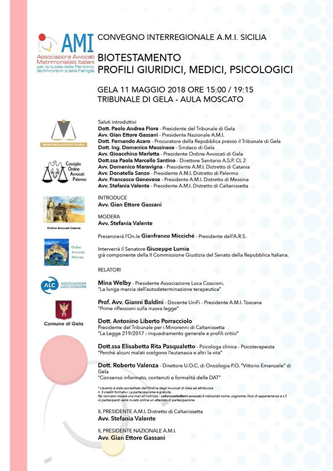 Si ricorda che l’evento è stato accreditato dall’Ordine degli Avvocati di Gela ad attribuire 3 crediti formativi. La partecipazione è gratuita.