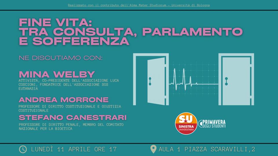 Con Mina Welby intervengono anche Stefano Canestrari, professore di diritto penale dell’Università di Bologna e membro del Comitato Nazionale per la Bioetica, e Andrea Morrone, docente di diritto costituzionale e di giustizia costituzionale dell’Università di Bologna.