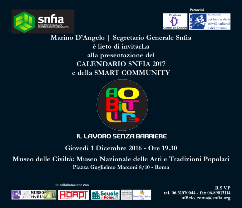 Mina Welby, co- presidente dell’Associazione Luca Coscioni, interverrà alla presentazione del calendario della SNFIA 2017 e la SMART COMUNITY IL LAVORO SENZA BARRIERE che si terrà il 1 dicembre p.v. dalle ore 19.30 presso il Museo delle Civiltà- Piazza Guglielmo Marconi 8/10.