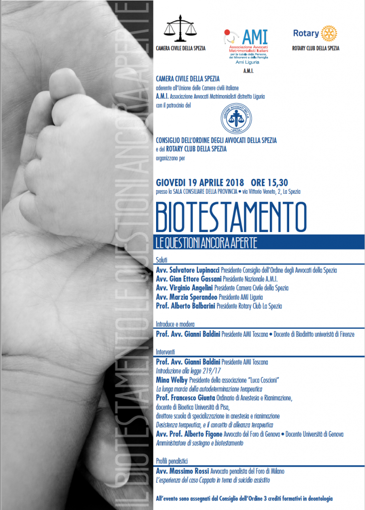 Mina Welby terrà un intervento denominato “La lunga marcia dell’autodeterminazione terapeutica”, mentre la relazione di Gianni Baldini sarà intitolata “Introduzione alla legge 219/17”. In chiusura, l’avvocato Massimo Rossi, membro del collegio difensivo di Marco Cappato nel corso del processo per il caso Dj Fabo, interverrà illustrando “L’esperienza del caso Cappato in tema di suicidio assistito”.