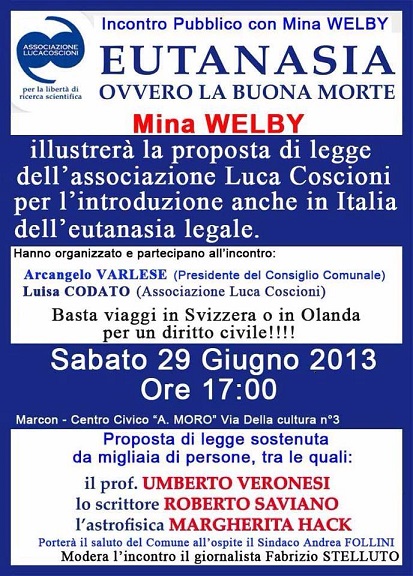Mina Welby illustrerà la proposta di legge per l’introduzione anche in Italia dell’eutanasia legale.