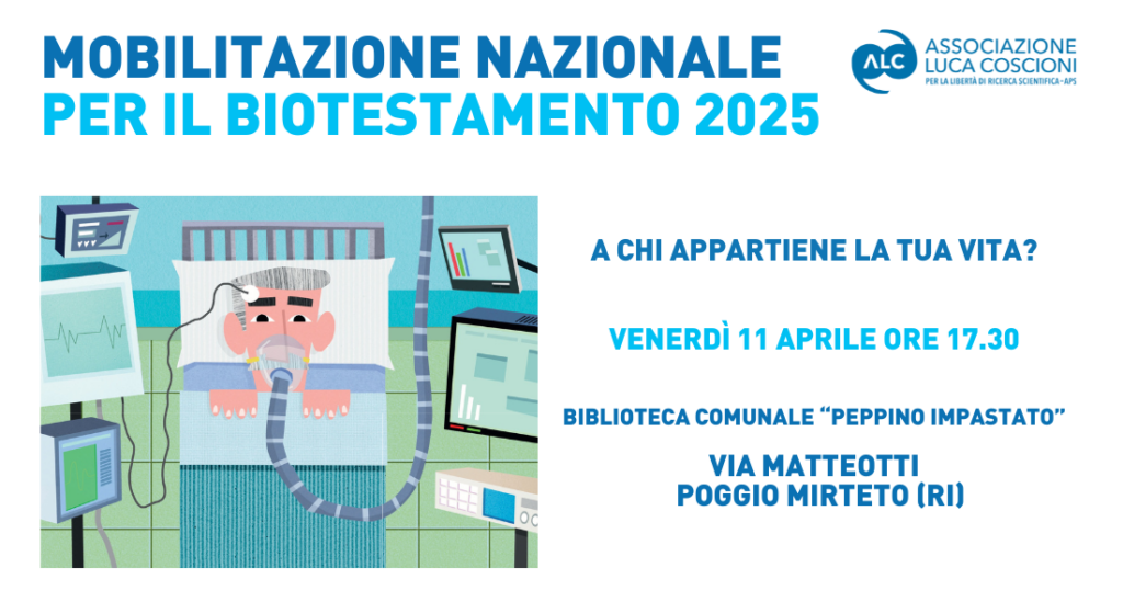In occasione della mobilitazione nazionale dell’Associazione Luca Coscioni per la campagna “Liberi subito”, si terrà l’incontro A chi appartiene la tua vita?, un momento di confronto e informazione sulle Disposizioni Anticipate di Trattamento (DAT) – legge 219/2017 – e sulla richiesta di adottare leggi regionali che garantiscano risposte in tempi certi alle persone che soffrono, nel rispetto di un diritto sancito dalla Corte Costituzionale.