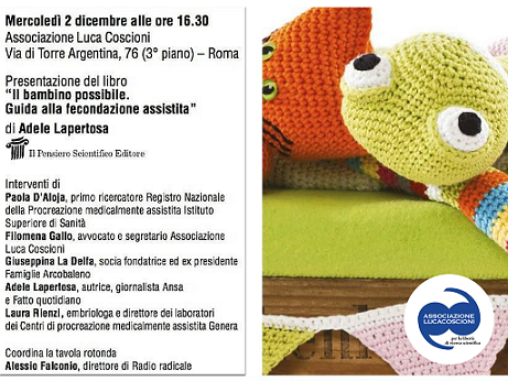 Il 2 dicembre dalle 16.30, presso la sede dell’Associazione Luca Coscioni presso il Partito Radicale, avrà luogo la presentazione Libro “Il bambino possibile. Guida alla fecondazione assistita”, scrido da Adele Lapertosa.