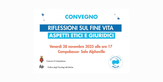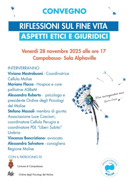 La Cellula Coscioni Molise, con il patrocinio del Comune di Campobasso e dell’Ordine degli Psicologi del Molise, organizza un convegno per affrontare i diversi aspetti – giuridici, etici, psicologici e clinici – legati al fine vita e alla libertà di autodeterminazione.