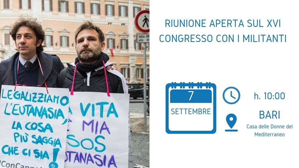 L’incontro sarà finalizzato a discutere dell’organizzazione e delle prospettive del XVI Congresso dell’Associazione Luca Coscioni, che si svolgerà al Politecnico di Bari dal 3 al 6 ottobre 2019.