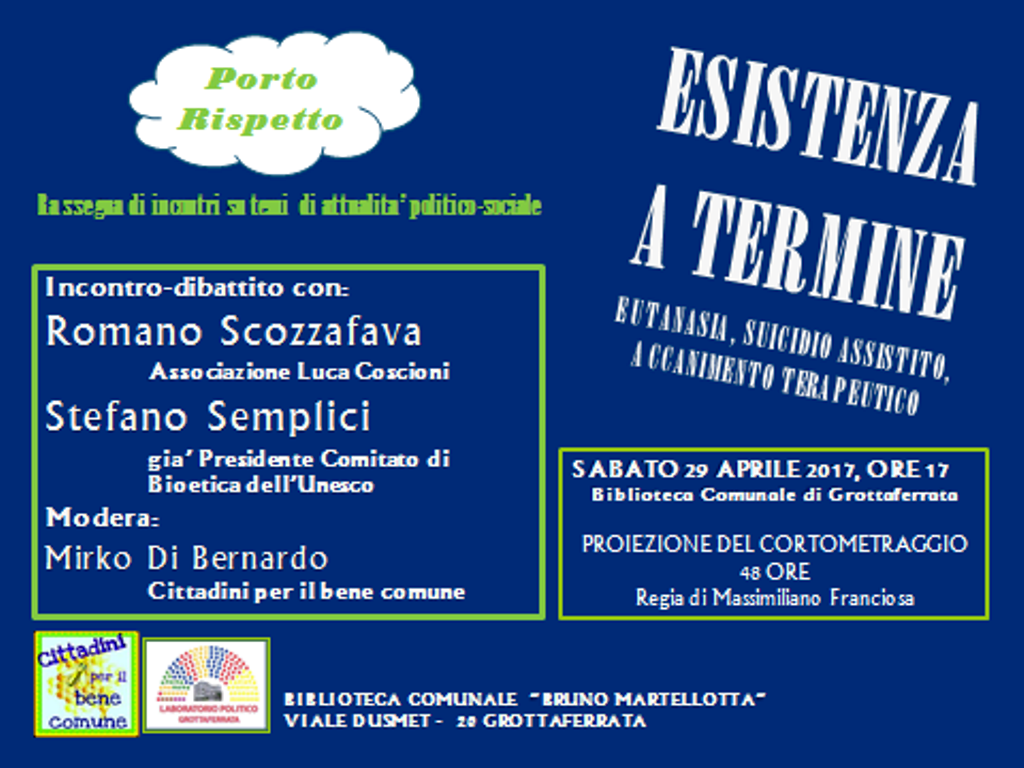 Romano Scozzafava, Consigliere generale dell’Associazione Luca Coscioni, interverrà al dibattito “Esistenza a termine”, che si terrà sabato 29 aprile dalle ore 17.00 presso la Biblioteca comunale Bruno Martellotta a Grottaferrata.