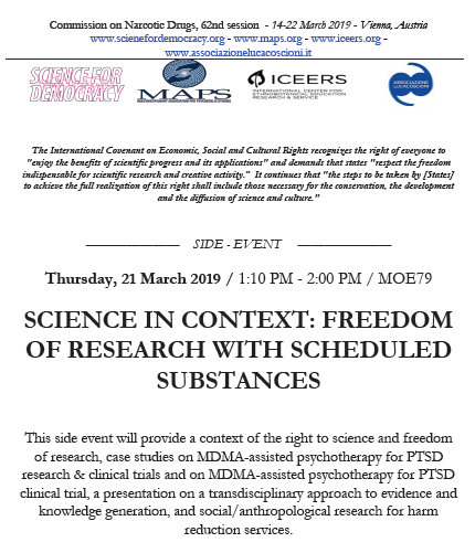 The meeting is organized by Associazione Luca Coscioni, Science for Democracy, MAPS and ICEERS. This side event will provide a context of the right to science and freedom of research, case studies on MDMA-assisted psychotherapy for PTSD research & clinical trials and on MDMA-assisted psychotherapy for PTSD clinical trial, a presentation on a transdisciplinary approach to evidence and knowledge generation, and social/anthropological research for harm reduction services.