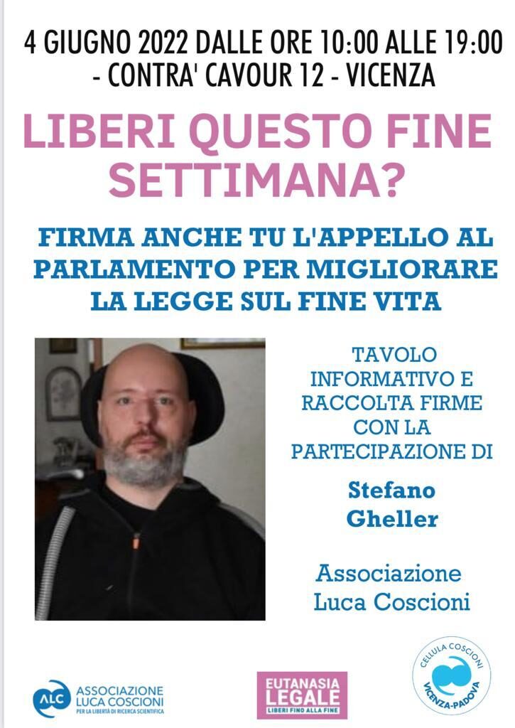 La Cellula Coscioni di Vicenza-Padova organizza un tavolo di raccolta firme per l’appello al Parlamento per un miglioramento della legge sul Fine vita.