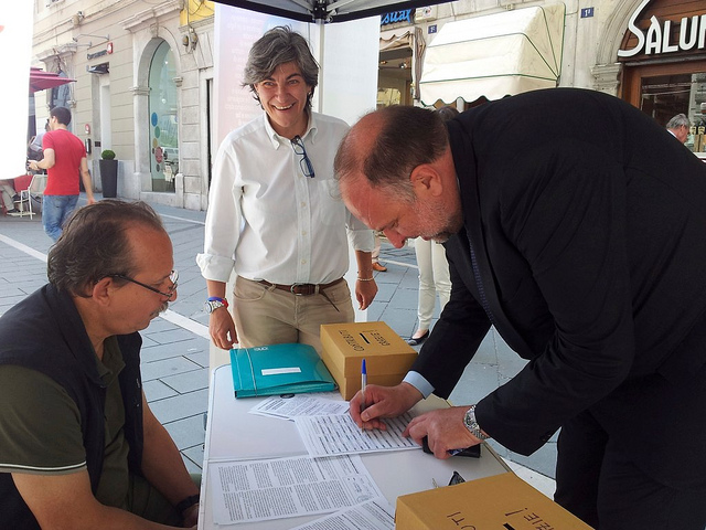 Tra queste quella del primo cittadino di Trieste. Cosolini, infatti, si è recato ieri al tavolo, organizzato da radicali, Associazione Luca Coscioni e Uaar, e si è lasciato fotografare nel momento dell’apposizione della firma. La firma del sindaco si aggiunge quindi alle già tante firme autorevoli delle istituzioni locali: i due parlamentari del Movimento 5 Stelle, Aris Prodani e Lorenzo Battista, l’assessore Umberto Laureni, i sette consiglieri comunali (Furlanic, Faraguna, Barbo, Gerin, Patuanelli,De Carli e Sossi) e la consigliera provinciale Sabina Morena. La raccolta firme prosegue ogni mercoledì e sabato in via delle Torri. Gli orari , ed altre informazioni sull’iniziativa, sono consultabili al sito www.radicalifvg.it.
