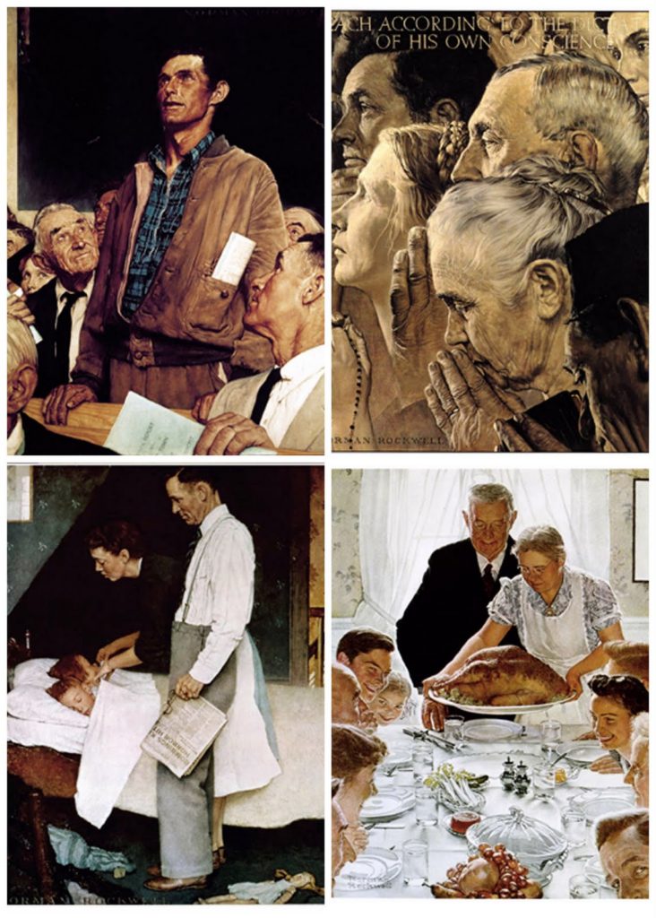 [Didascalia dell’immagine: Questo gruppo di opere di Norman Rockwell (1894-1979) pubblicato nel1943 sul The Saturday Evening Post si ispira al celebre discorso al Senato del Presidente Franklin D. Roosevelt, il 6 gennaio 1941, sulle quattro libertà fondamentali:libertà dal chiedere, libertà dalla paura, libertà di parola, libertà di culto]