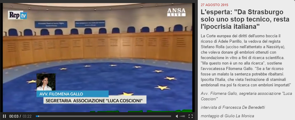 La Corte europea dei diritti dell’uomo boccia il ricorso di Adele Parrillo, la vedova del regista Stefano Rolla (ucciso nell’attentato a Nassiriya), che voleva donare gli embrioni ottenuti con fecondazione in vitro a fini di ricerca scientifica. “Ma questo non è un no alla ricerca”, sostiene l’avvocatessa Filomena Gallo. “Se a far ricorso fosse un malato la sentenza potrebbe ribaltarsi. Ipocrita l’Italia, che vieta l’estrazione di staminali embrionali ma poi fa ricerca con embrioni importati”